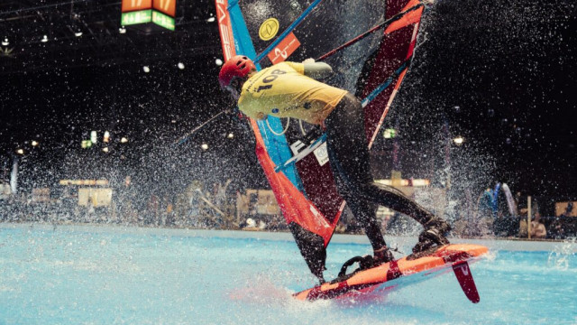 Throughout the day, riders soaked up the Boot Dsseldorf experience, hanging out around the show, exploring the convention, jumping into the pool for some pump-foil action, and socializing in the areas surrounding Hall 17. The calm before the storm. And when the clock hit 16:45, the storm finally arrived.